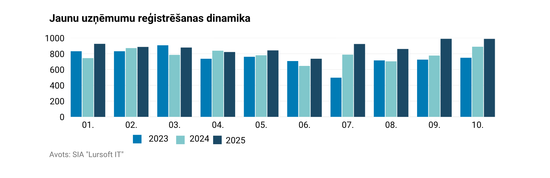 2025.gada oktobrī jaunu uzņēmumu reģistrēšanas aktivitāte saglabājusies stabila – mēneša laikā reģistrēti 990 jauni uzņēmumi, kas ir tikpat, cik septembrī. Savukārt, salīdzinot ar pagājušo gadu, uzņēmumus reģistrē vairāk. Pagājušajā mēnesī reģistrēto uzņēmumu kopējais pamatkapitāls veido 12,18 milj. eiro, un pieciem no tiem tas sasniedz vai pārsniedz miljona eiro atzīmi, liecina sabiedrības ar ierobežotu atbildību “Lursoft IT” dati.