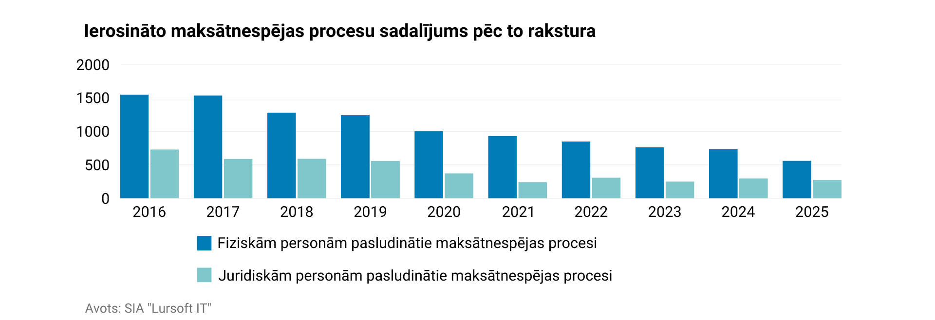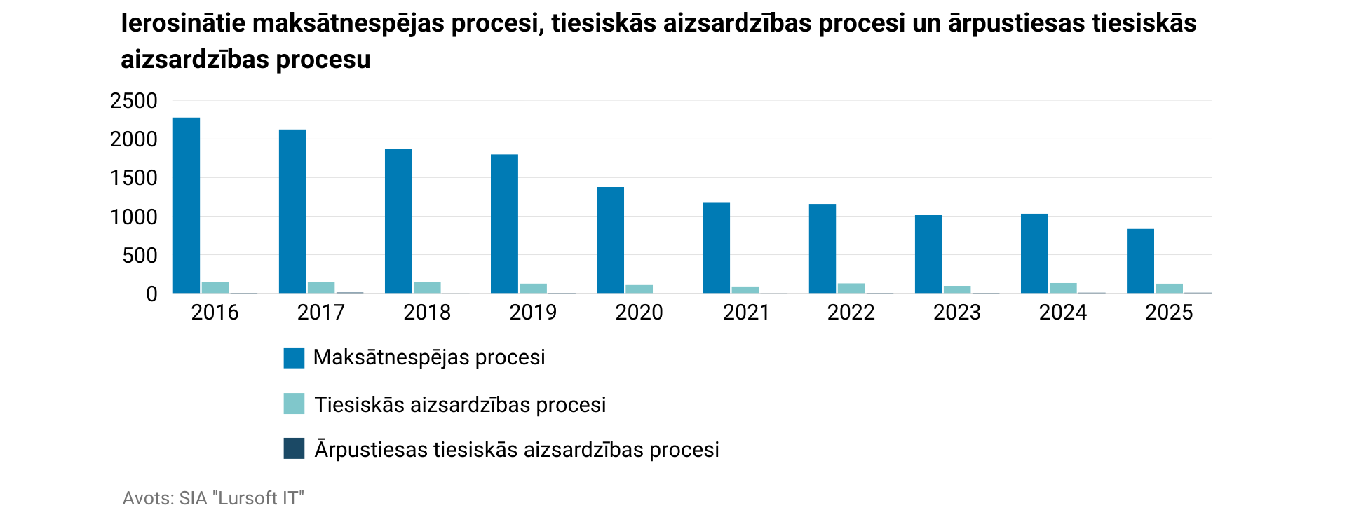 Pēdējās desmitgades laikā Latvijā pakāpeniski samazinājies pasludināto maksātnespējas procesu skaits, 2025.gadā tam sarūkot līdz 836, kas ir par 19,15% mazāk nekā gadu iepriekš. No pasludinātajiem maksātnespējas procesiem trešā daļa pasludināta juridiskām personām. Vienlaikus ierisināto tiesiskās aizsardzības un ārpustiesas tiesiskās aizsardzības procesu skaita dinamika liecina par uzņēmumu centieniem savlaicīgi meklēt risinājumus finanšu grūtību pārvarēšanai, vēl pirms nonākšanas maksātnespējas stadijā, liecina sabiedrības ar ierobežotu atbildību “Lursoft IT” dati.
